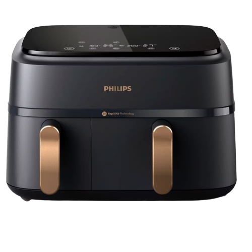 Philips er et af de mest anerkendte navne inden for airfryere, og 3000-serien leverer på den front. Med en samlet kapacitet på 9 liter fordelt på to separate kurve af forskellig størrelse kan du tilberede hovedret og tilbehør på samme tid. En praktisk synkroniseringsfunktion sørger for, at begge kamre er færdige samtidig, og en kopifunktion gør det muligt at anvende samme indstillinger i begge kurve med ét tryk.