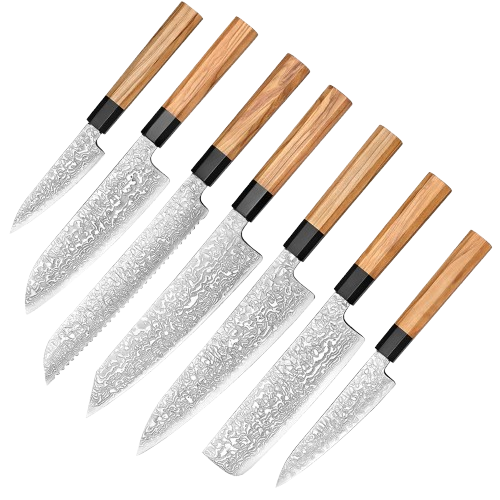 Complete Set Rose er et komplet knivsæt i 67-lags damaskusstål med VG-10 kernestål, udviklet til dig der ønsker maksimal kvalitet i køkkenet. Sættet indeholder syv specialknive, som tilsammen dækker alle skære-, hakke- og snitteopgaver. Den høje hårdhed på 62 HRC sikrer langvarig skarphed, mens de ergonomiske palisanderhåndtag giver optimal balance og kontrol.