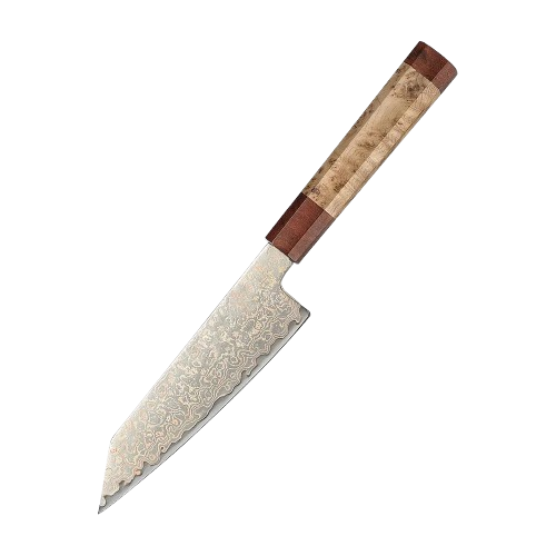 Gozuki Bunka 165 mm kombinerer japansk håndværk med avanceret stålkvalitet for præcise snit i køkkenet. Kniven har Rinzen #1 kernestål og 37 lag damaskus i kobber, messing og rustfrit stål, som sikrer skarphed og holdbarhed. Den klassiske Bunka-form gør kniven alsidig til grøntsager, fisk og kød. Det ottekantede Wa-skæfte i mønstret ahorn og padauk burl giver et ergonomisk greb og optimal balance. Perfekt til både professionelle kokke og madentusiaster, der ønsker kontrol og stil i ét værktøj.