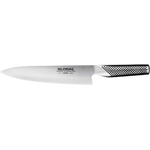 Global G-2 er en ikonisk japansk kokkekniv, der har været en favorit i professionelle køkkener i årtier. Det karakteristiske design uden synlige samlinger giver den et elegant, minimalistisk udseende. Den er let (omkring 170 gram), har et blad på 20 cm og et hult stålhåndtag, der er afbalanceret med fint sand. Global G-2 er blevet kåret som bedst i test af flere uafhængige testpaneler og er et fremragende valg for både amatører og professionelle.