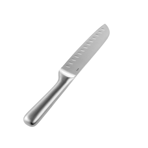 Mami Santokukniv fra Alessi, designet af Stefano Giovannoni, kombinerer funktionalitet og stil. Kniven er fremstillet i AISI 420-stål med mat finish og har et ergonomisk håndtag for komfortabelt greb. Den lille Santoku er ideel til grøntsager, urter og mindre kødstykker, og passer både til hjemmekokken og den professionelle.