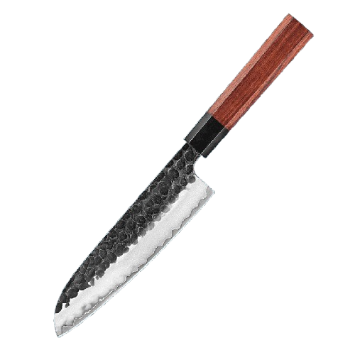 Opdag glæden ved præcisionsskæring med Tanuki Santoku 180mm, en japansk allround kokkekniv til både kød, grøntsager og fisk. Kniven har en hård 10Cr15CoMoV stålkerne med 2 yderlag SUS cladding og hamret Kurouchi-finish, som giver en unik, rustbeskyttende overflade. Det 8-kantede Wa-skæfte i Red Wood og sort Buffalo Horn ligger behageligt i hånden og giver optimal kontrol ved hakning, snit og skæring. Perfekt til både professionelle kokke og madentusiaster, der ønsker en holdbar og skarp kokkekniv.