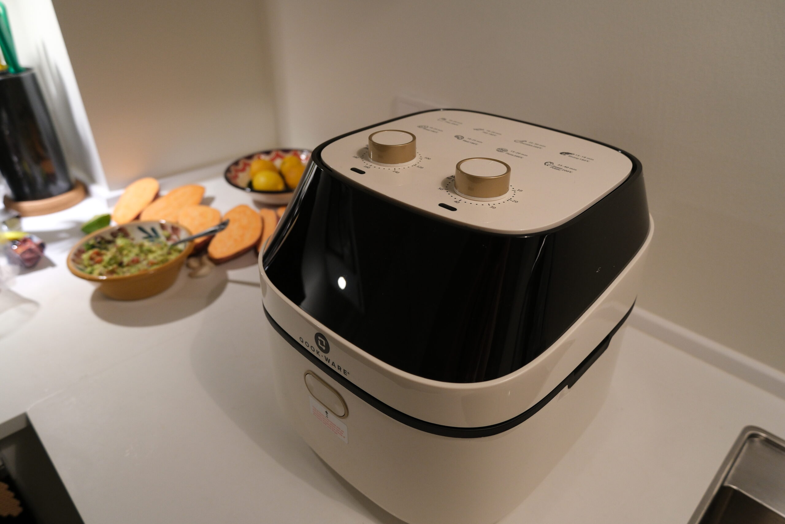 Noget af det første, man lægger mærke til, er størrelsen. 7,5 liter er i den store ende, hvilket gør Qookware Airfryer oplagt til: