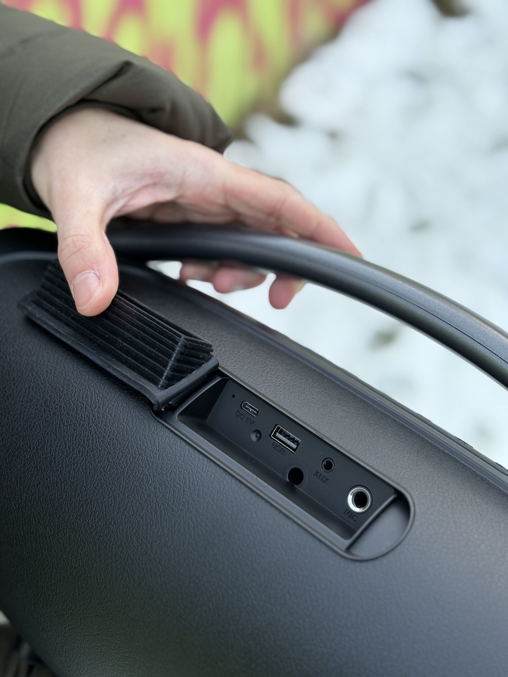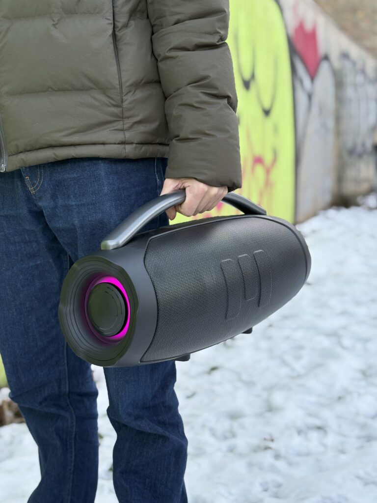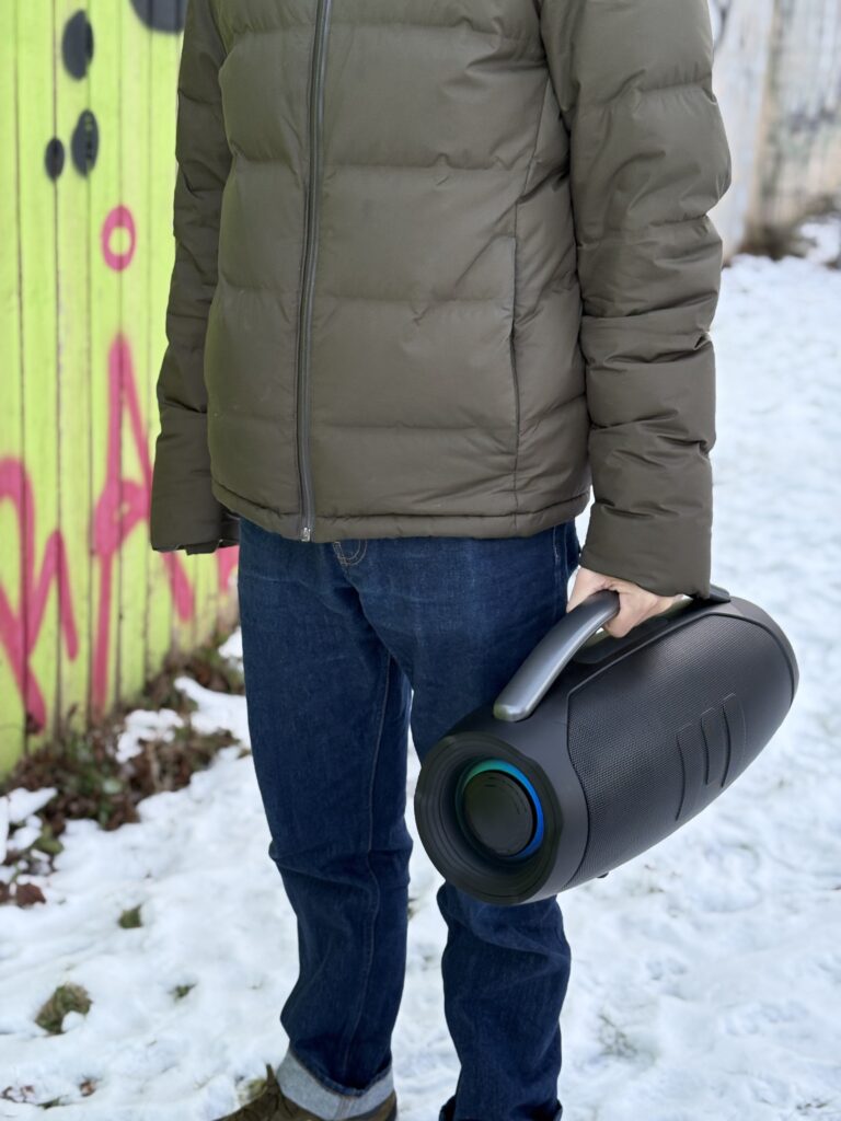 Det, der virkelig skilte sig ud, var højttalerens fleksibilitet. Den kan stå stabilt på bordet, placeres på jorden, eller bæres over skulderen med det praktiske indbyggede håndtag. Samtidig imponerer batteritiden: op til 8 timers musik på én opladning betyder, at festen kan fortsætte hele dagen, uden at man behøver at tænke på opladning.