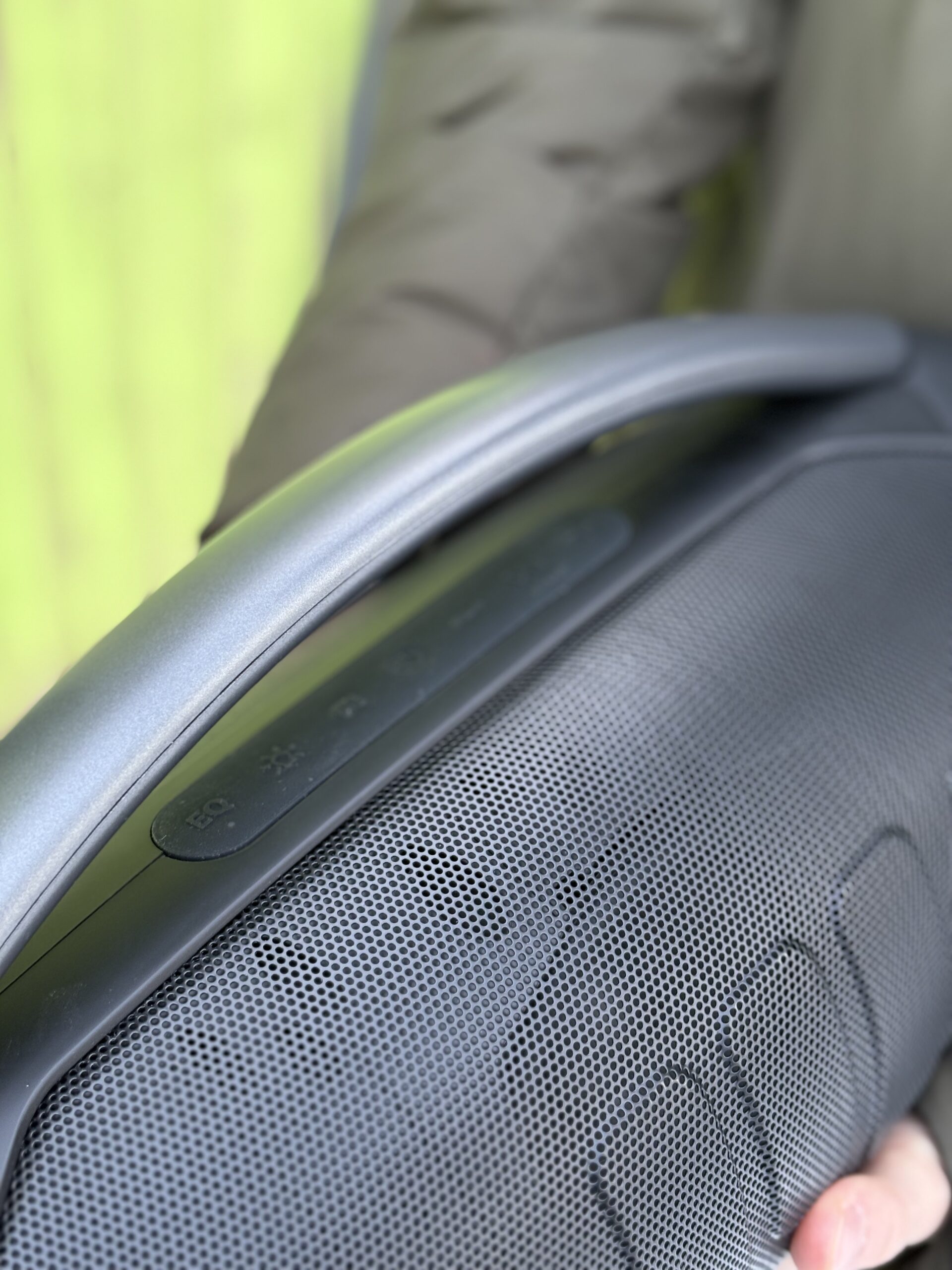 Det bedste ved højttaleren er dens bærbarhed. Det indbyggede håndtag gør det nemt at tage den med fra stuen til terrassen, på picnic eller endda til stranden. Med en vægt på kun 3,3 kg og kompakte mål på 45 x 19 x 24 cm, føles den stor i lyd, men stadig let at transportere.