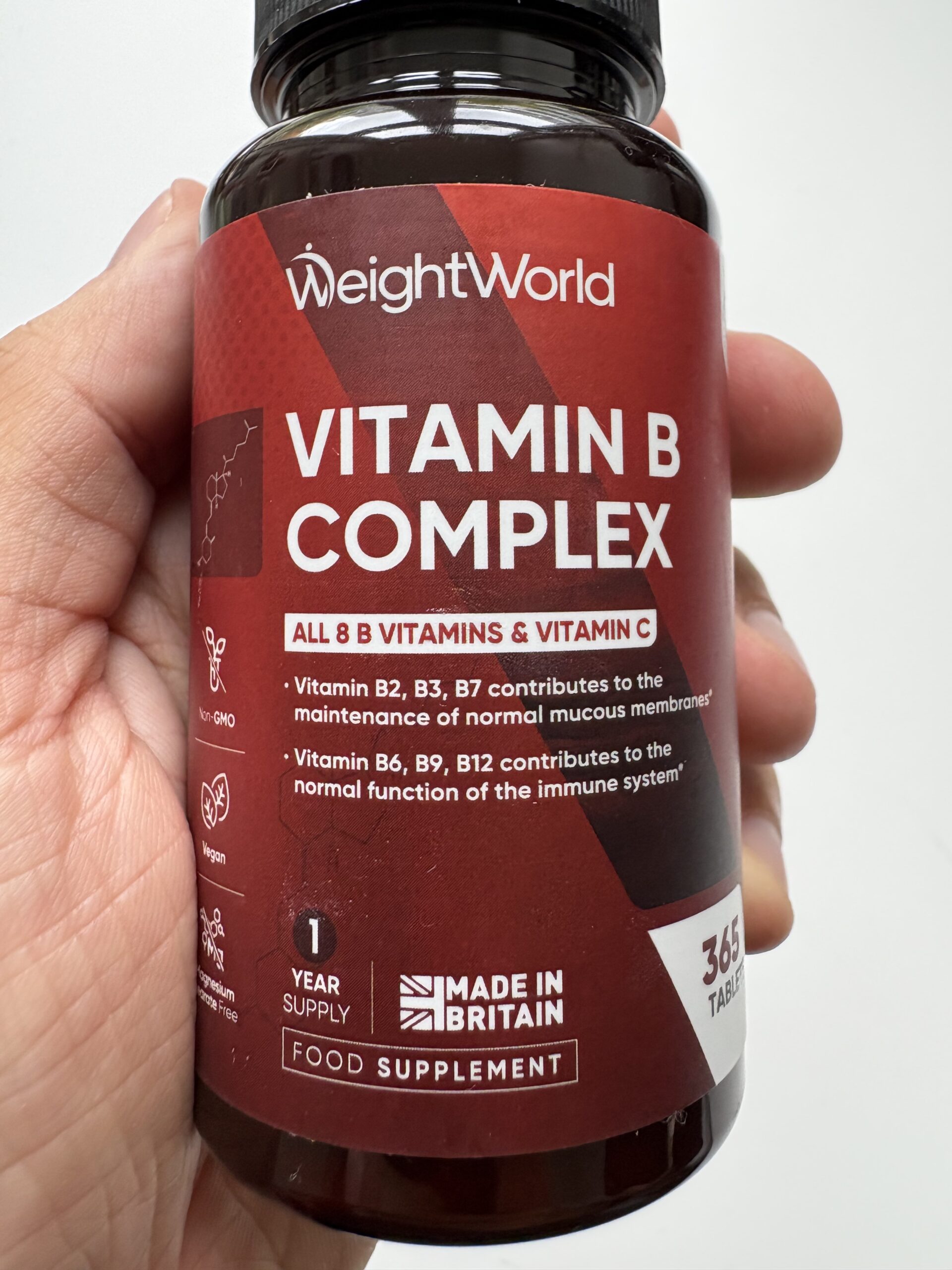 WeightWorld B-Vitamin Complex giver dig alle 8 B-vitaminer samt C-vitamin i én tablet om dagen. Tilskuddet er vegansk, GMO-frit og glutenfrit – og du får en hel års forbrug i én bøtte. Det er et oplagt valg til dig, der ønsker at mindske træthed, støtte dit immunforsvar og vedligeholde hud, hår og negle.