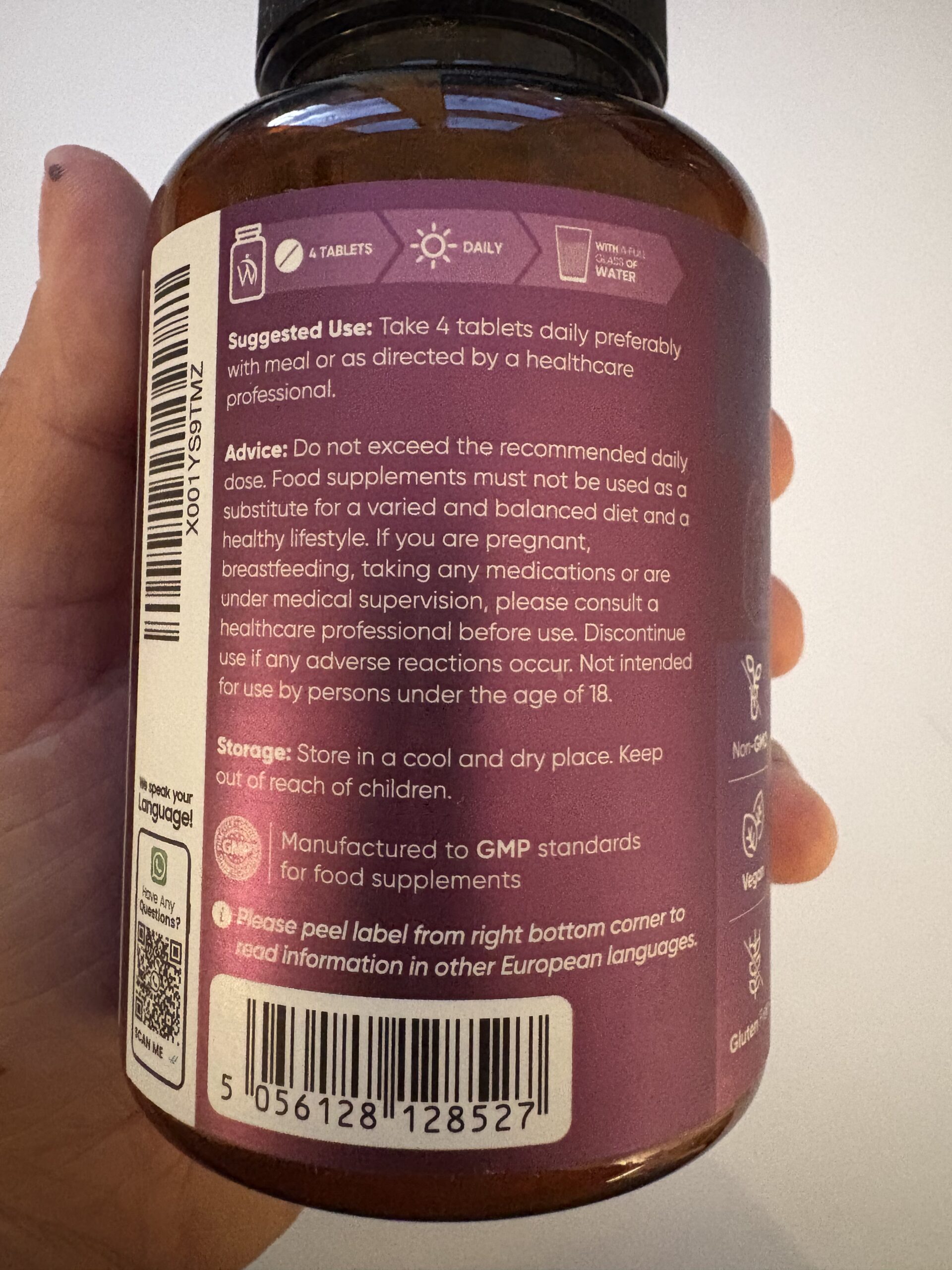 Den anbefalede dosis er 4 tabletter dagligt, gerne sammen med et måltid og et stort glas vand. Hver bøtte indeholder 120 tabletter, hvilket svarer til 30 dages forbrug.